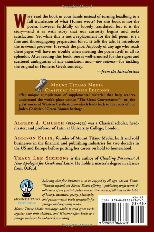 "...while this is not a replacement for the full poem, it’s a fine and thoroughgoing preparation for it. It tells the tale. It introduces the dramatis personae. It reveals the plot. Anybody of any age who reads these pages will have no trouble when meeting the poem itself in all its splendor. After reading this book, one is well-armored for the rigors and scattered ambiguities of any translation and—deo volente—for tackling the original in Homeric Greek someday."